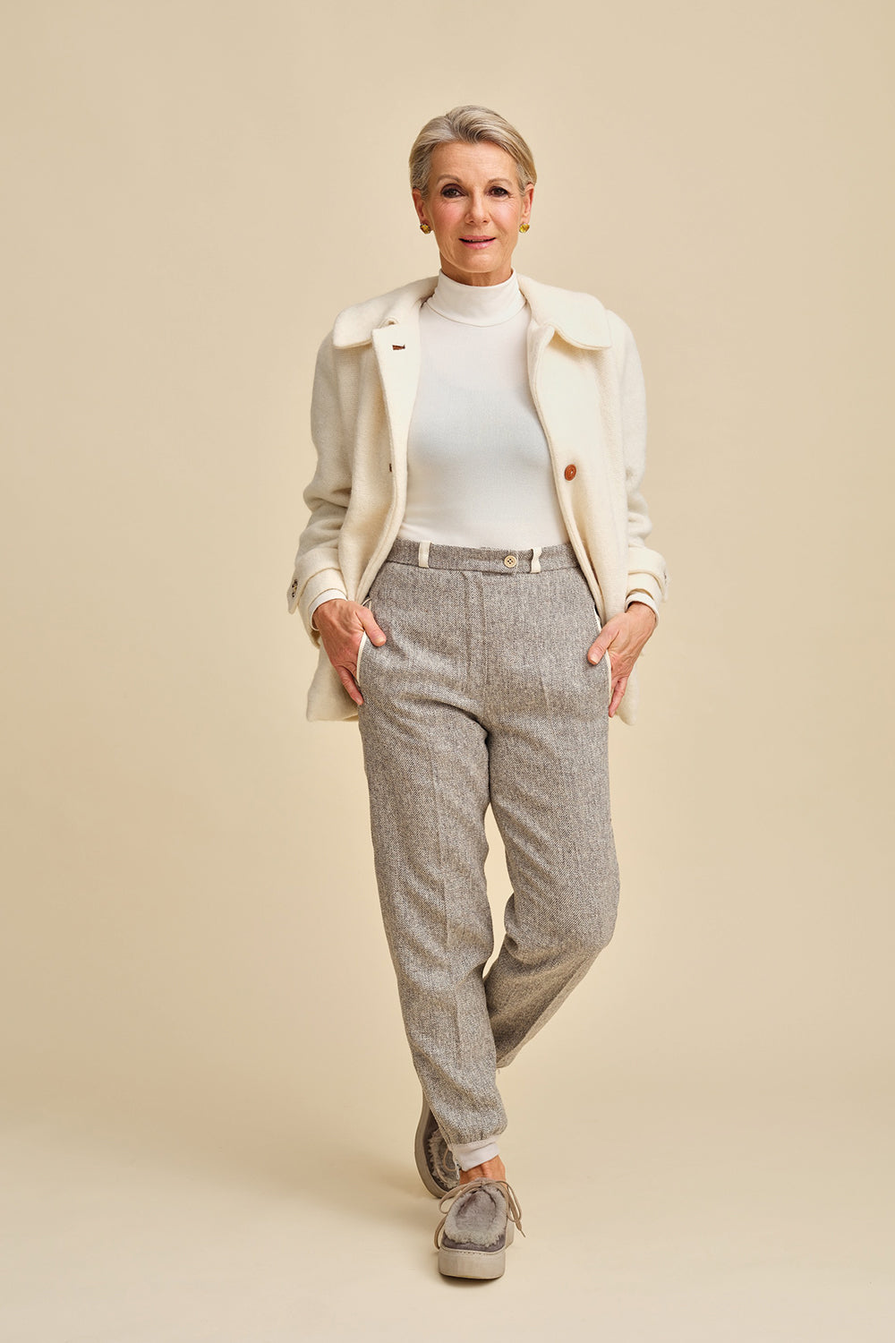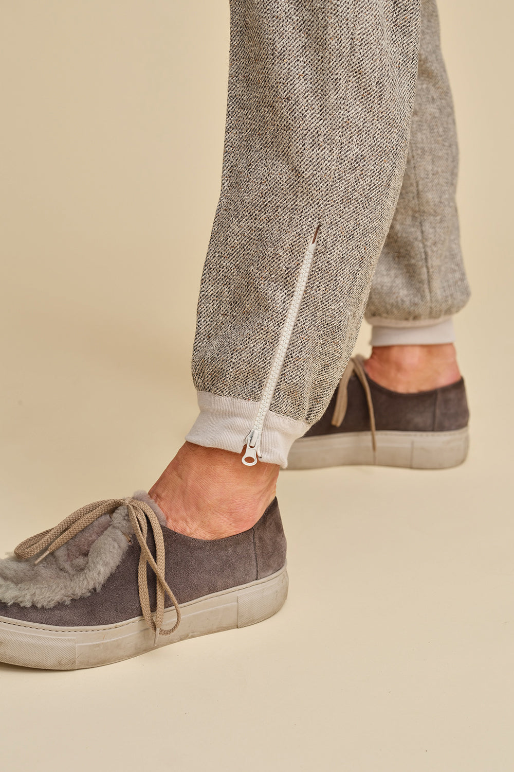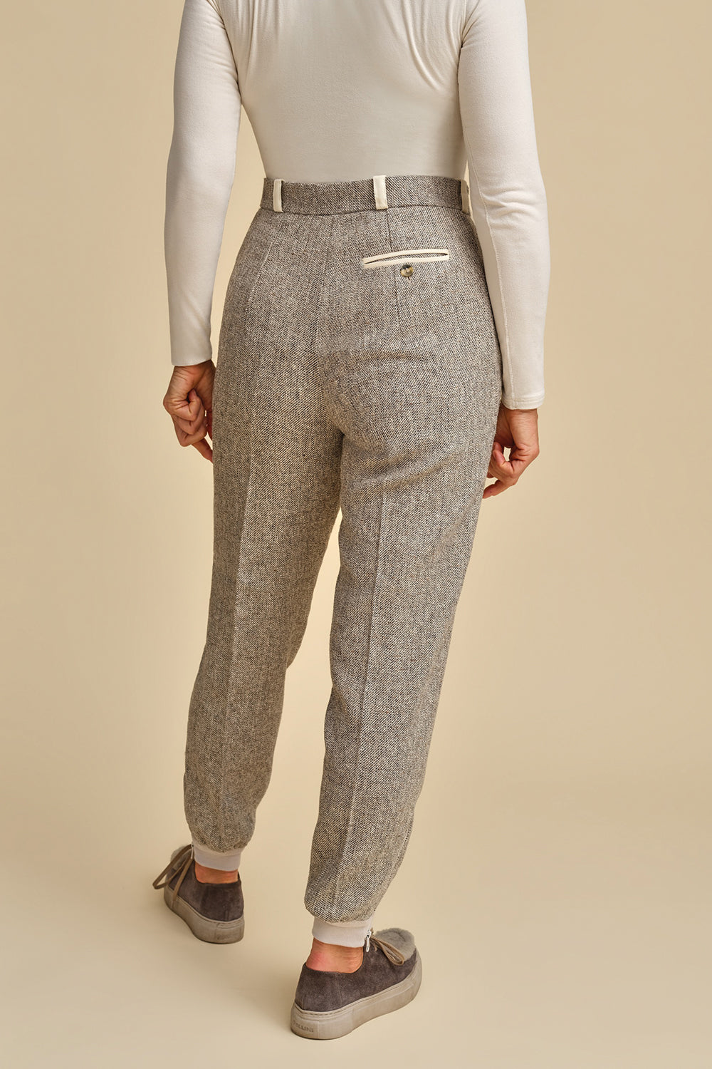 The zipper closure at the ankle adds a modern athleisure vibe, while the classic waistband with belt loops offers a timeless appeal. Crafted from unexpected fabrics like men’s tweed, these pants defy convention and make a statement wherever you go.