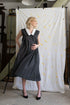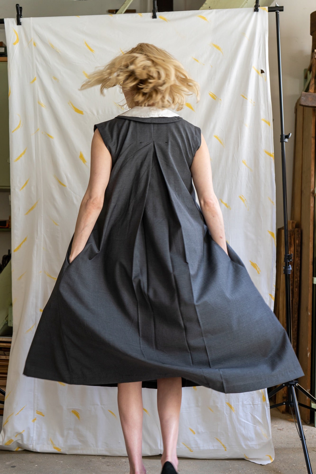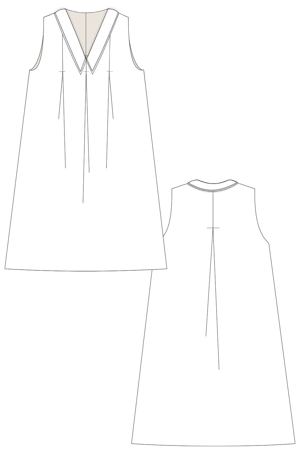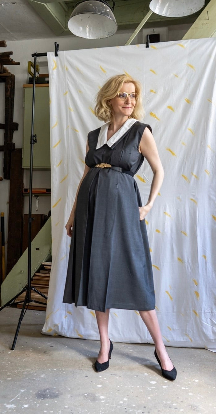This pleated, sleeveless dress with long collar is part of our maternity fashion collection of sisterMAG No. 62. An elegant, loose dress with pleated details without sleeves that can be worn with or without an attached white, long collar. Also can be worn with or without a belt.
