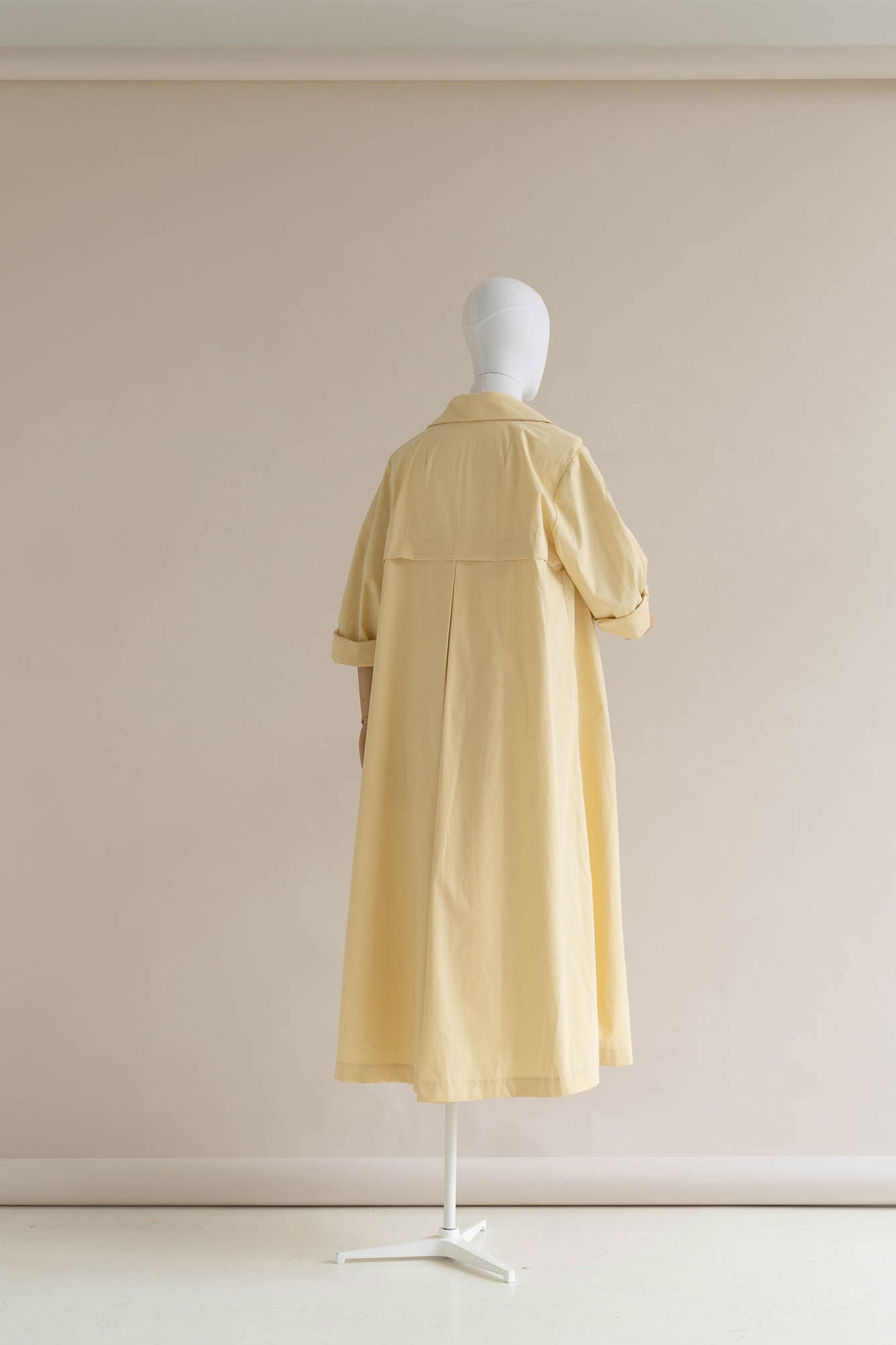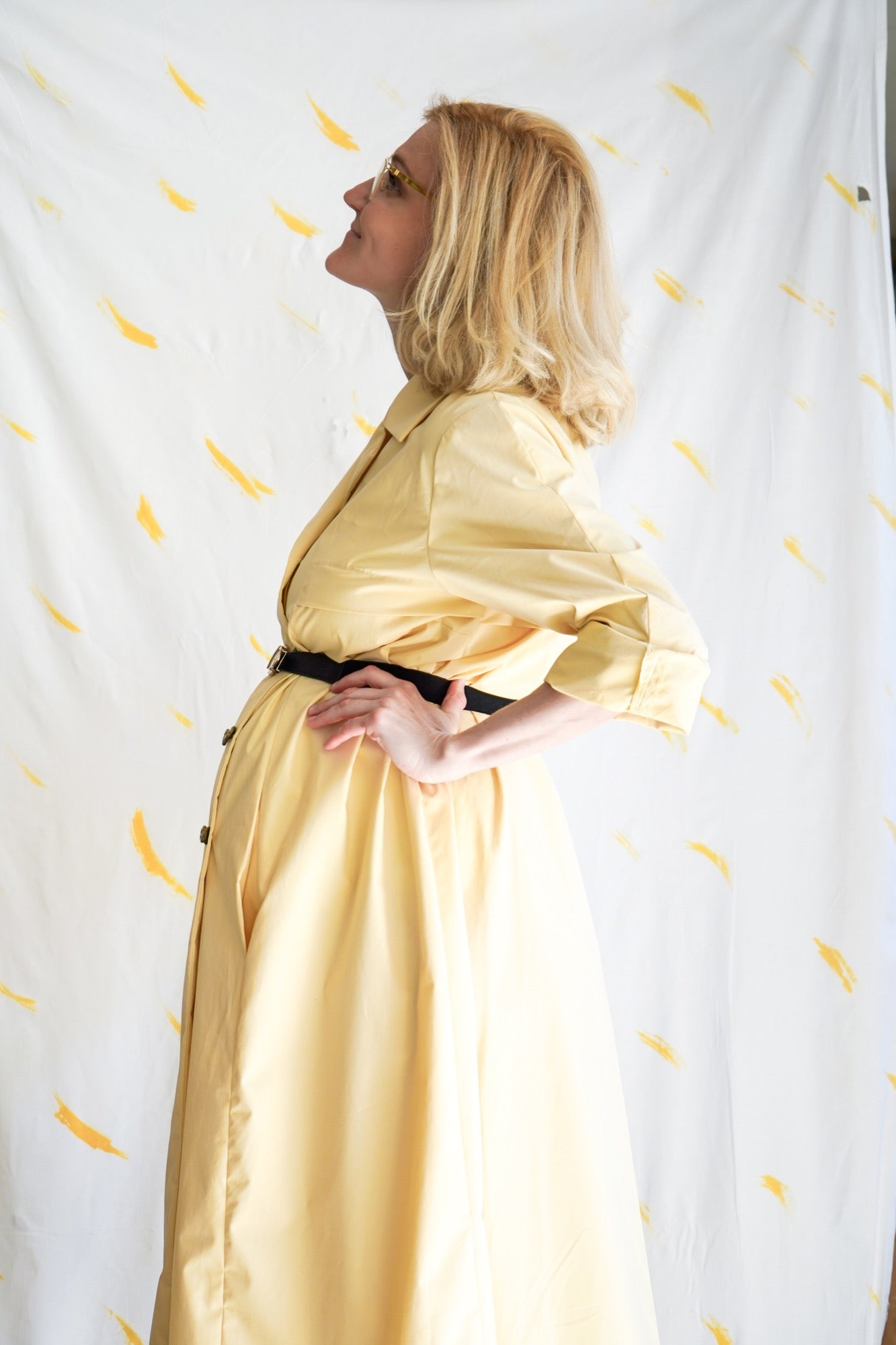 This dress is part of our maternity collection, but can be worn pregnant and beyond that time. It is a very elegant, double-breasted dress with a large collar and interesting back composition – with a yoke and large pleat that makes it extra-roomy. Four buttons at the front hold it together. A bit of a crossover of a trench-coat style dress and a shirt dress, you'll definitely feel comfortable.