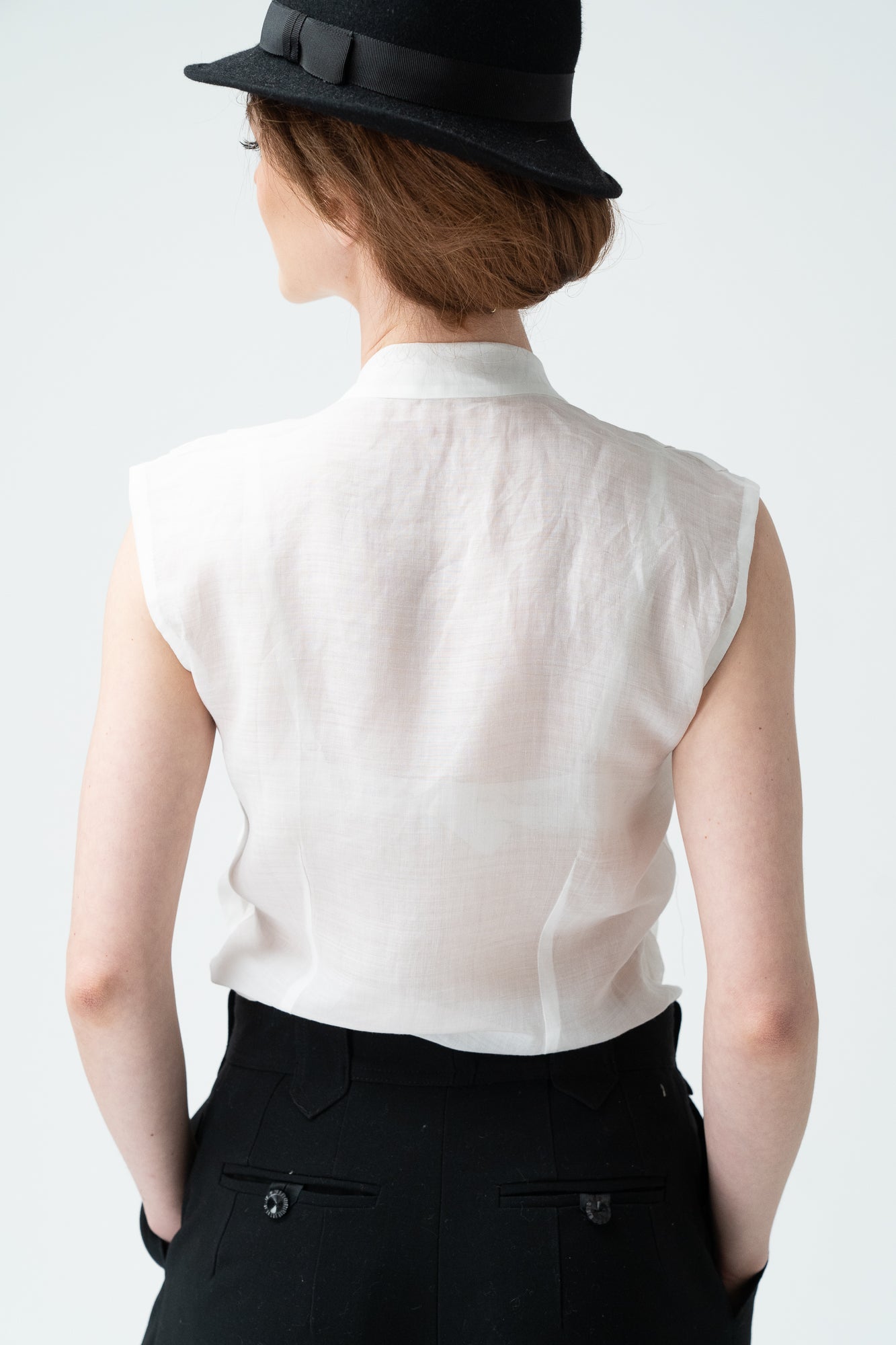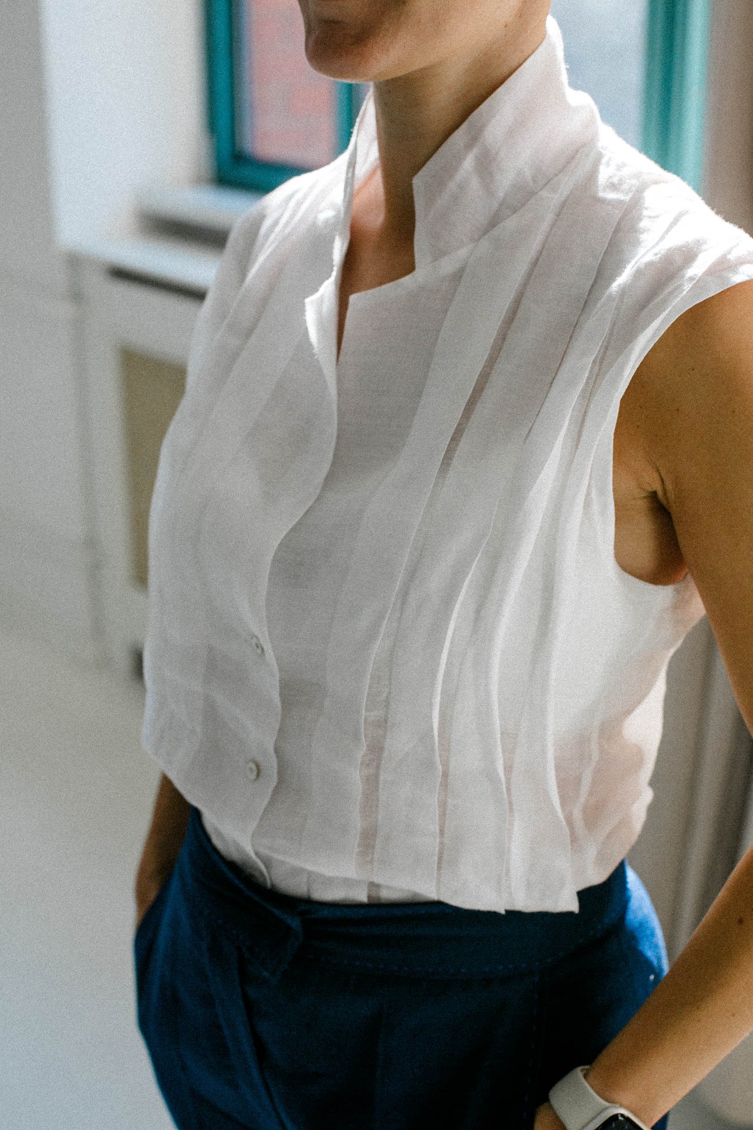 This sewing pattern is tailored for intermediate sewists who are eager to take on a fulfilling challenge. With detailed instructions and careful guidance, you'll delight in bringing this blouse to life. It features felled seams for a more durable blouse, the lapel collar construction, the armholes are finished with bias tape.