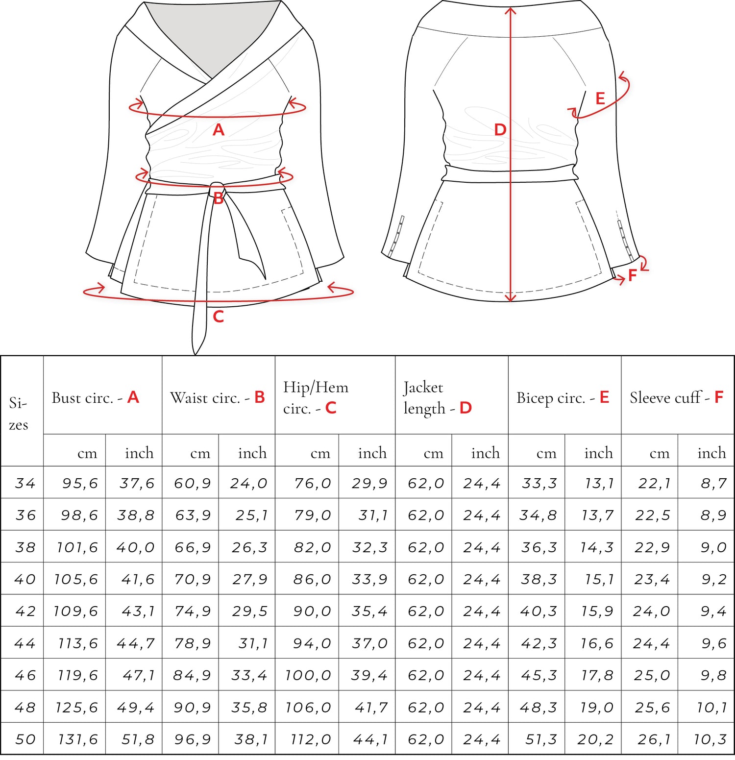 Please find the final measurements of the garment in this table. The measurements can also be found in the instruction booklet.