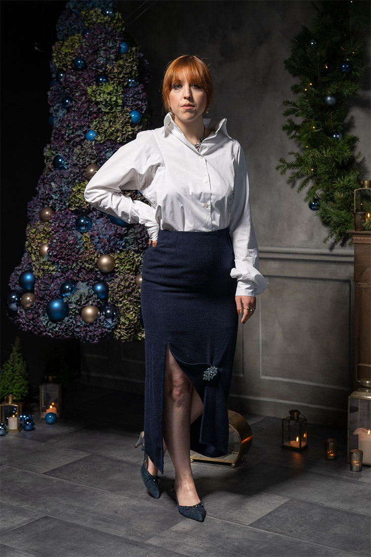 This slim-fit maxi skirt with vent from our sisterMAG and sisterMAG Patterns Advent Calendar Shooting is ideally made of a wool fabric and is easy to sew. The vent can be provided with a brooch, for example, to enhance the look of the skirt. The vent also allows a view of the leg and is perfect for special occasions or casually combined with tights e.g. for working days in the office.