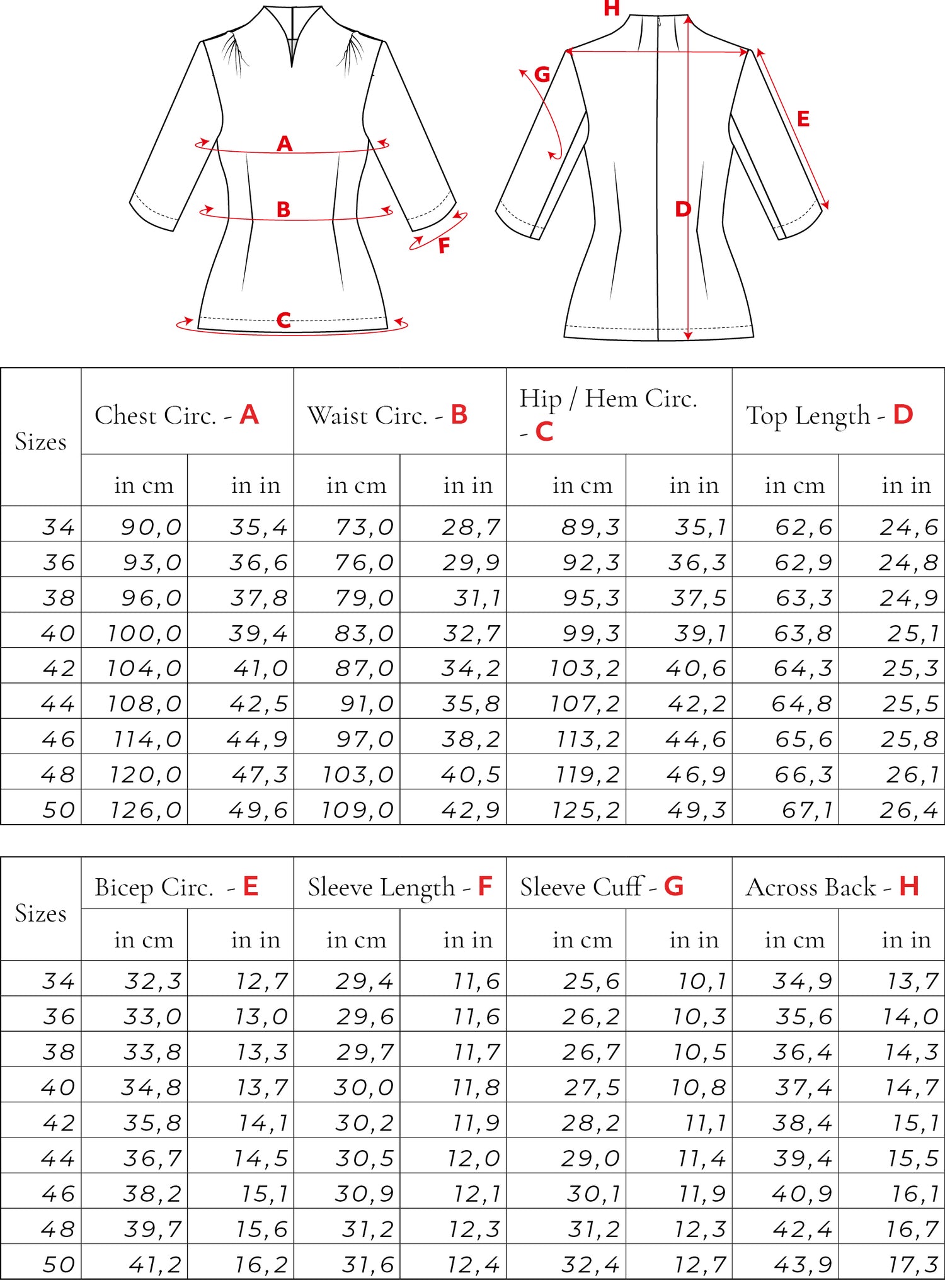Size chartAs important as the right fabric: the fitting and finding the right size for your body shape. Check out our Size Chart to see which of the included sizes will fit you best.