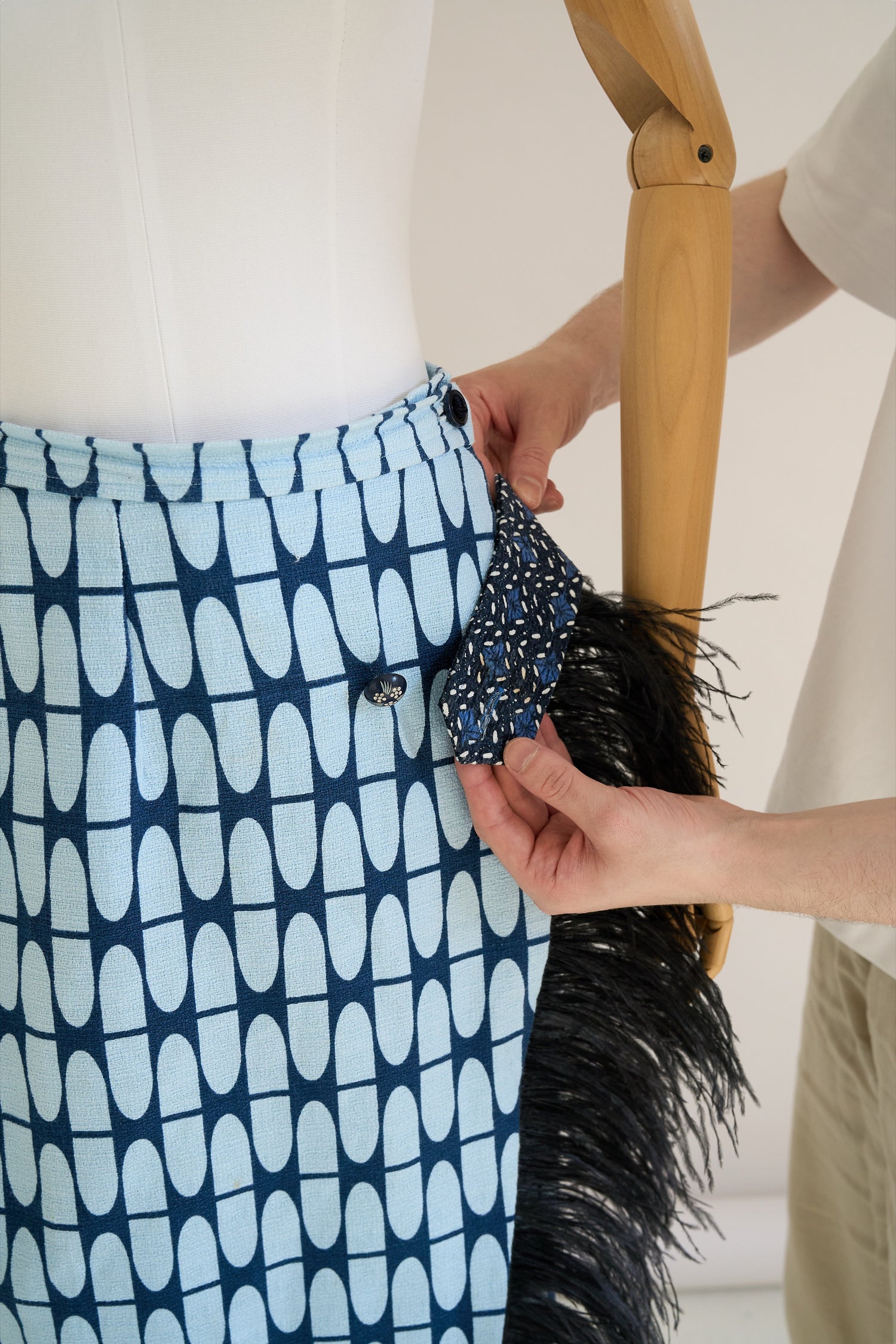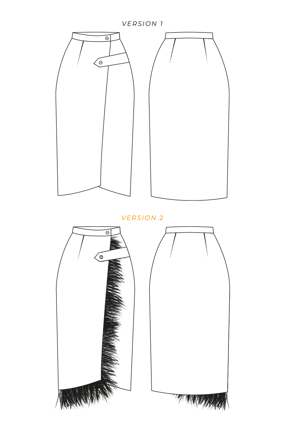 A truly eye-catching design with asymmetry, statement details, and two finishing options: the 28-5 ANGLED Skirt is a modern, fashion-forward piece that adds edge to your me-made wardrobe. Whether you opt for the minimalist buckle closure (Version 1) or the feather-trimmed version with full lining and button tab (Version 2), this pattern offers stylish versatility for intermediate sewists.