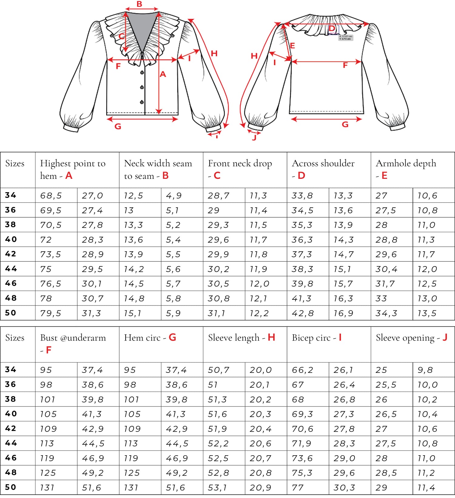 Please find the final measurements of the garment in this table. The measurements can also be found in the instruction booklet.