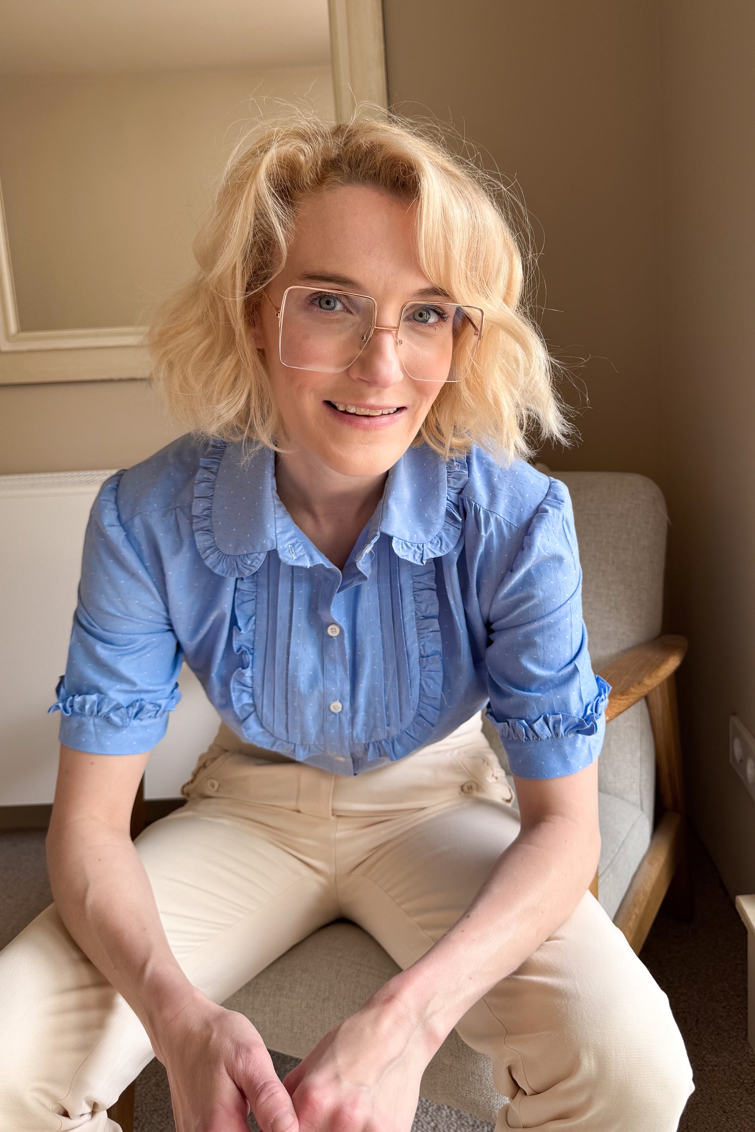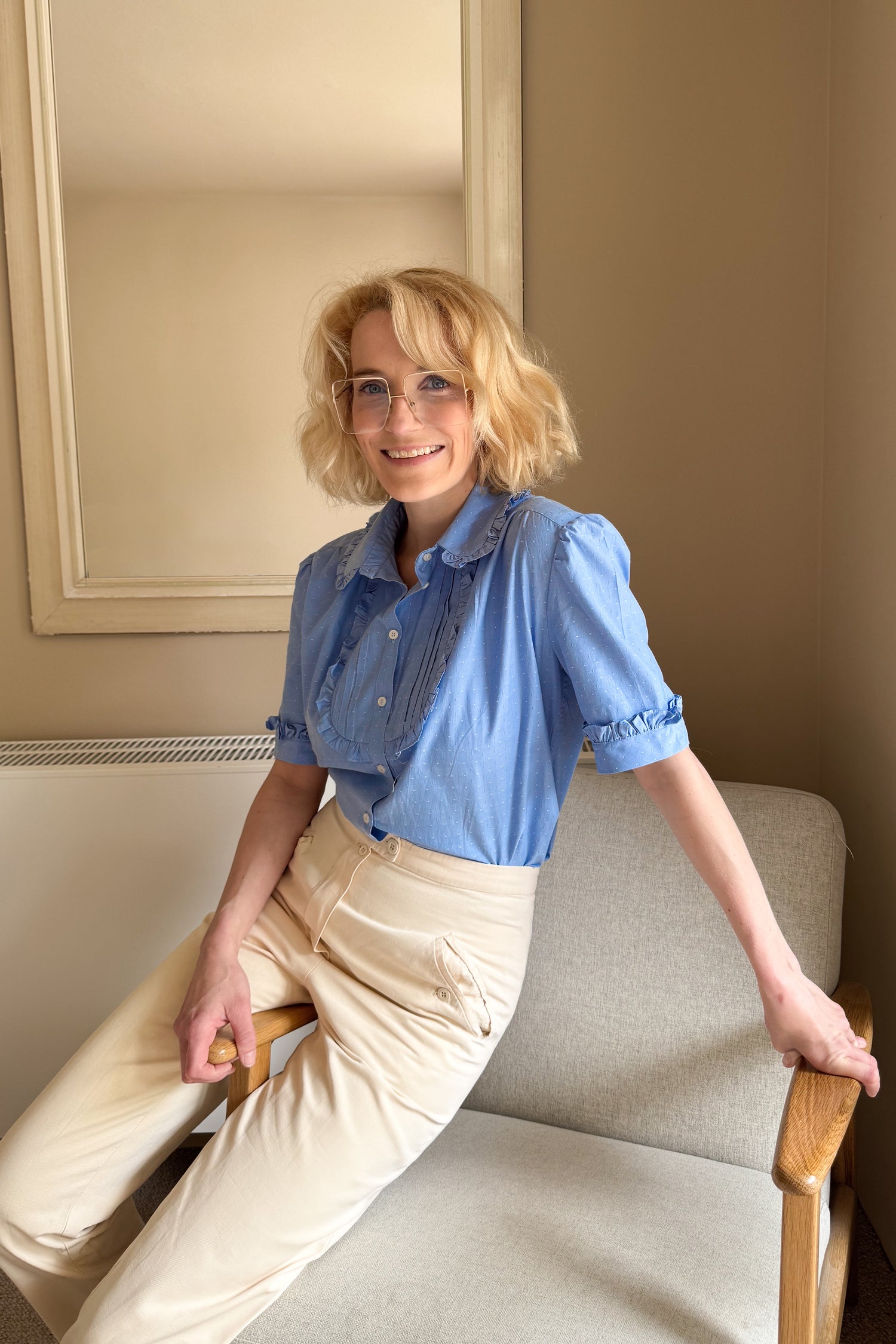 A nostalgic blouse with playful details and a flattering silhouette in the style of Sézane, Cyrillus or other French designer trends: this short-sleeved button-up blouse charms with its rounded collar, pintucked bib front and delicate ruffle trims. Pair it with high-waisted trousers or a skirt for a refined yet relaxed daytime look.