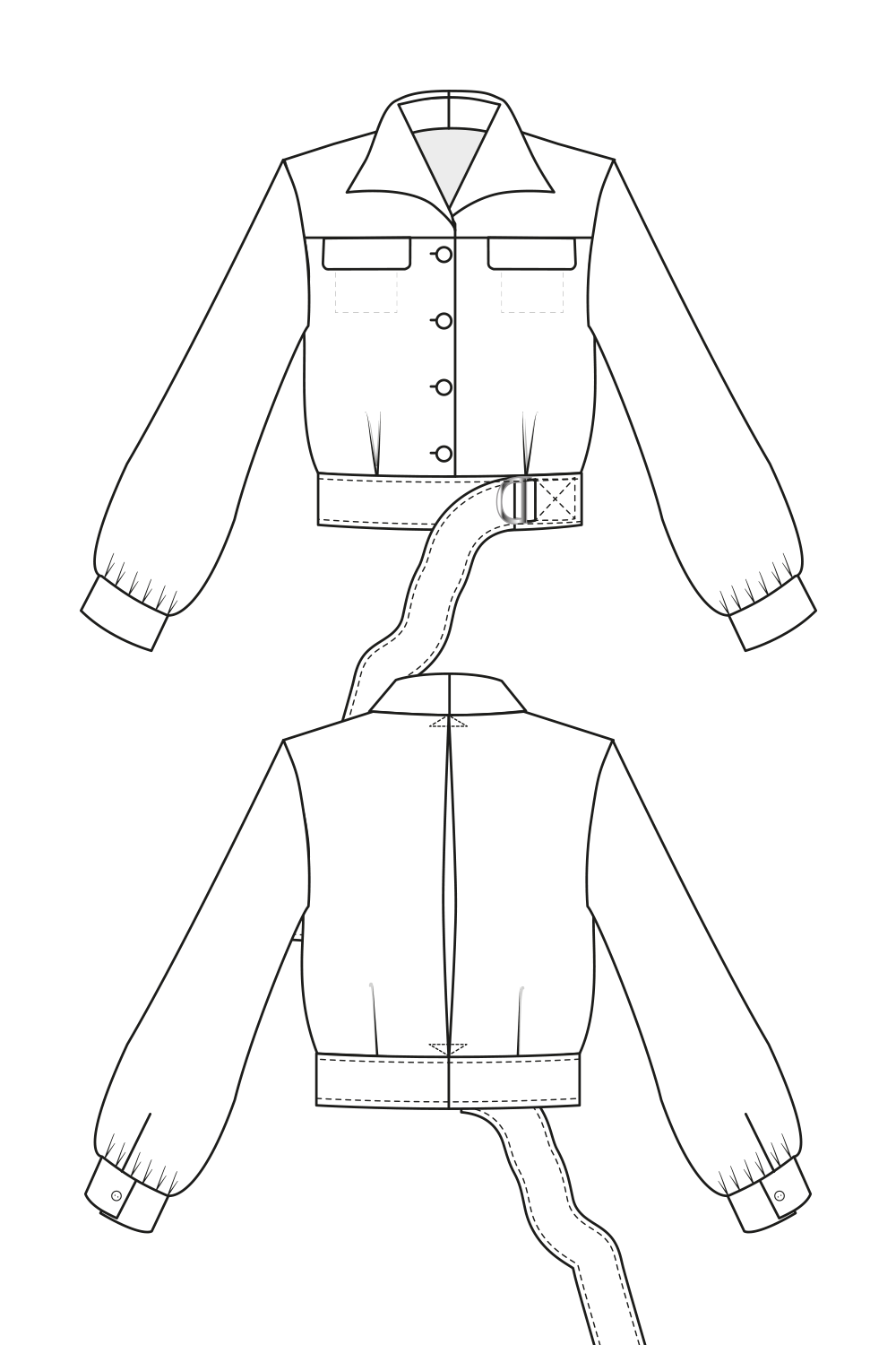 • Front Construction – Two-part front with an upper section (with collar) and a lower section joined at the pocket seam, including marked pleats for subtle shaping.
