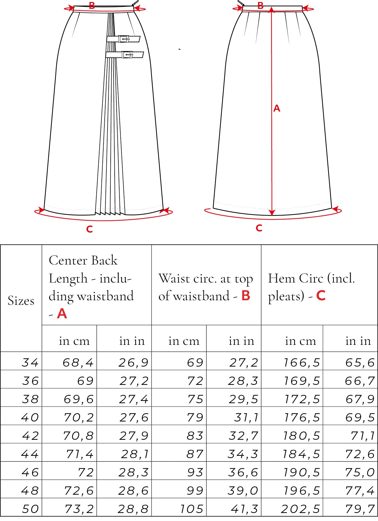 Please find the final measurements of the garment in this table. The measurements can also be found in the instruction booklet.