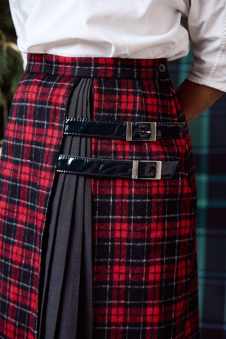 The TARTAN Skirt reimagines the classic kilt with a modern, structured silhouette. Featuring a striking pleated panel, clean front sections, and two leather buckle tabs, this design blends traditional tailoring with contemporary edge. The asymmetrical look, the precise pressed pleats, and the beautiful movement of the fabric make TARTAN a standout piece—perfect for elevating everyday outfits or adding a bold touch to special occasions.