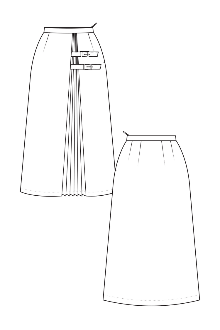 Separate left and right front skirt panels that overlap the pleated panel for a clean, tailored finish.
